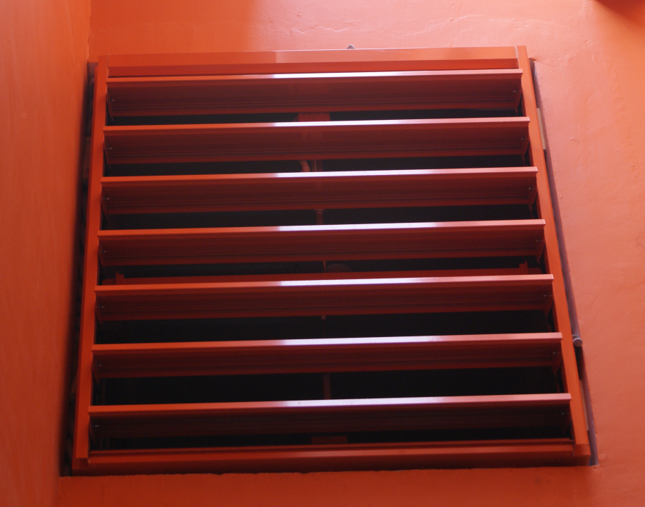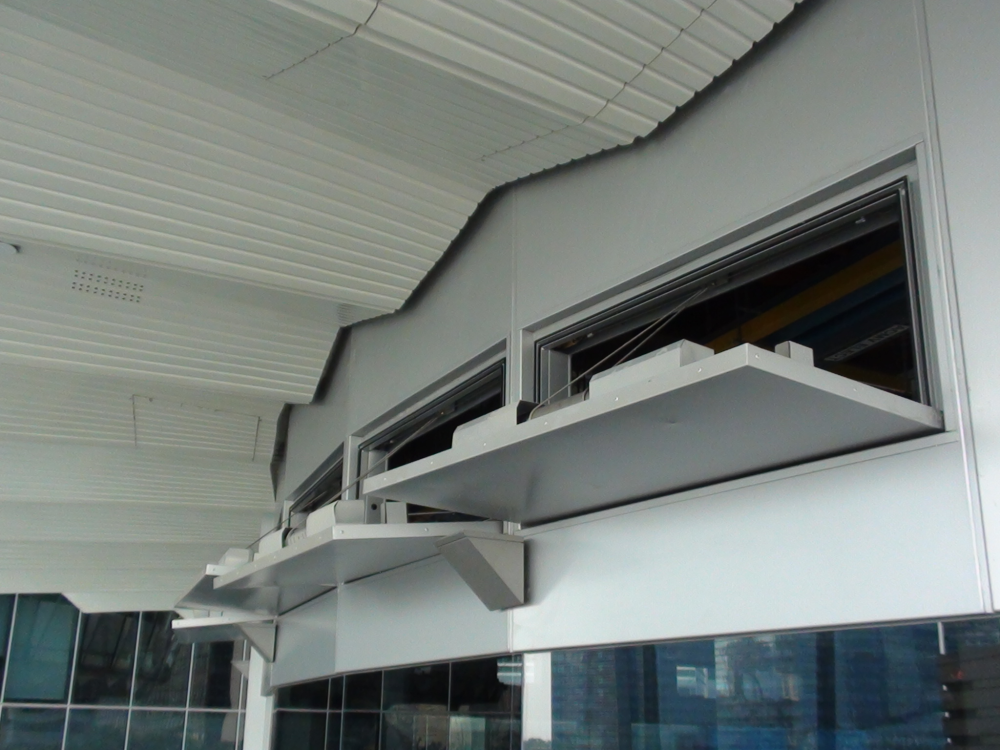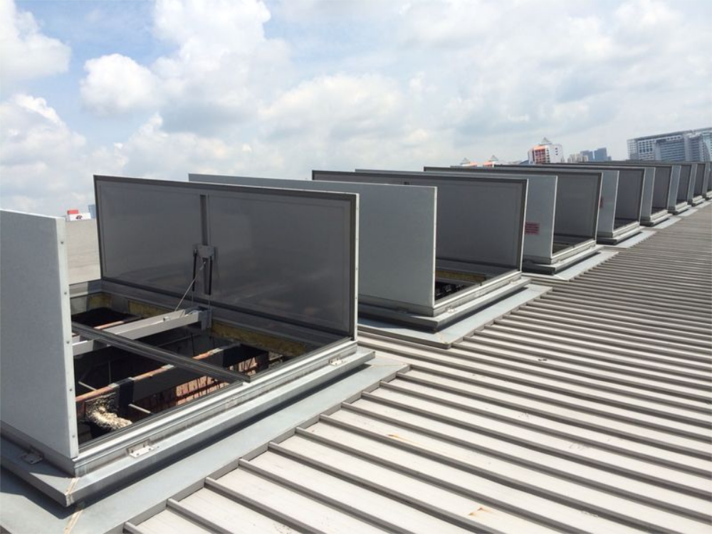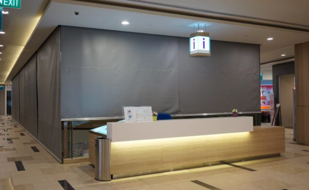 During a fire, the smoke curtain receives a signal from the fire detection system and automatically unrolls, forming a physical smoke barrier.